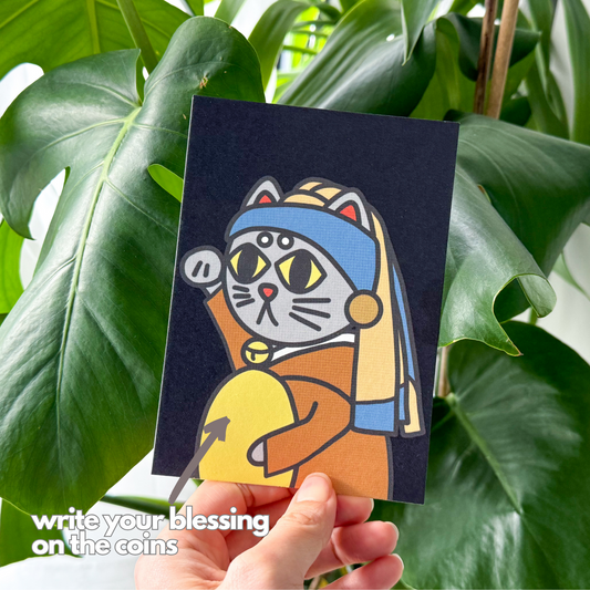 Blessing cat with a Pearl Earring | Original Design A6 Prints Blessing Card